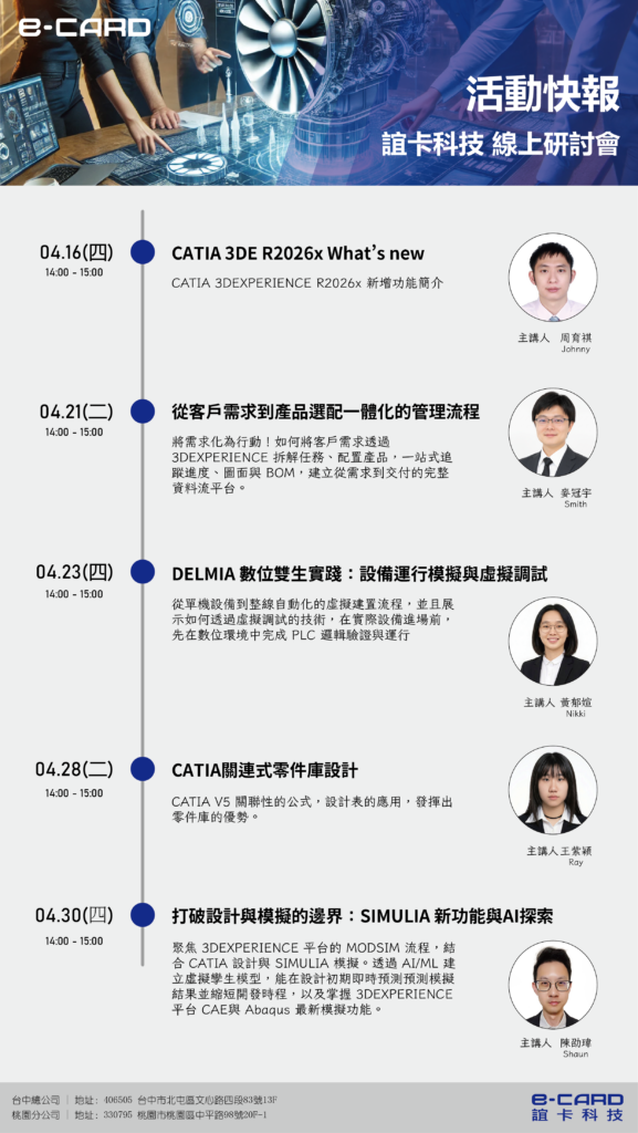 📆 4/16 ( 四 ) | CATIA 3DE R2026x What’s new 📆 4/21 ( 二 ) | 從客戶需求到產品選配一體化的管理流程 📆 4/23 ( 四 ) | DELMIA 數位雙生實踐:設備運行模擬與虛擬調試 📆 4/28 ( 二 ) | CATIA 關連式零件庫設計 📆 4/30 ( 四 ) | 打破設計與模擬的邊界:SIMULIA 新功能與 AI 探索