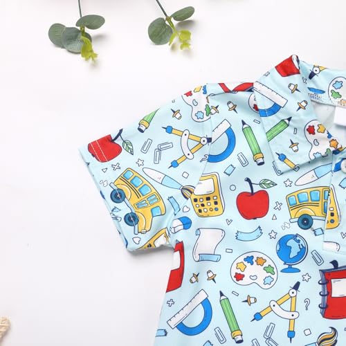 • Boys Back To School Clothes: timeless little kids back to school short sleeve button up shirt, help your boy start a new day at school. Short sleeve lapel collar shirt, 1 4 button placket at front, features a pocket at chest. Printed with pencils, crayons, notebook, ruler, clock, scissors, apple, school bus, makes the shirt look so adorable. The pullover style makes it convenient to put on or off. wonderful to match with shorts or pants, and great for casual, daily, party or photoshoot;