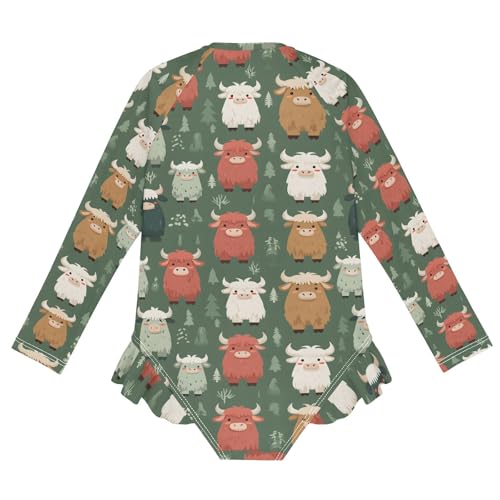 Carton Yak Pattern Girls Long Sleeve Swimsuit Rash Guard One Piece Bathing Suits Zipper 3-12T 4
