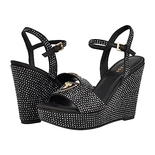• Feel flashy in the Hippa wedge by Guess, which is adorned by clear stones allover and a Guess triangle hardware piece on front band.