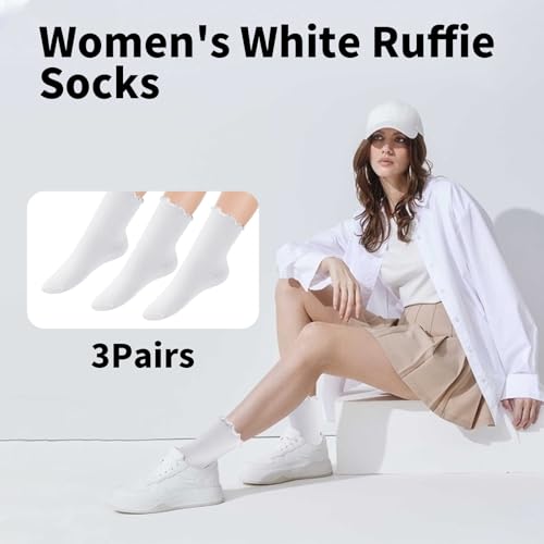 3 Pairs White Ankle Socks Woman - Casual Cotton Crew Frilly Sock,Solid Color Breathable Soft Crew Socks 1