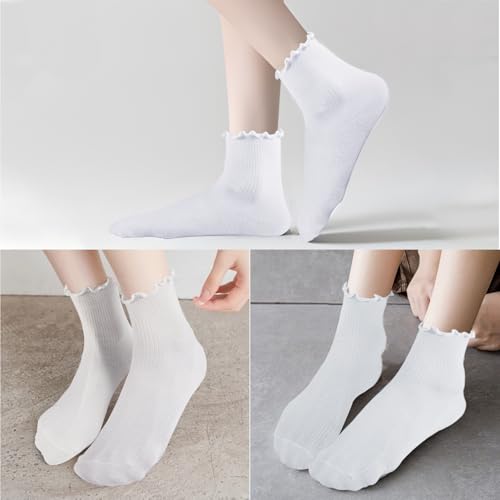 3 Pairs White Ankle Socks Woman - Casual Cotton Crew Frilly Sock,Solid Color Breathable Soft Crew Socks 5