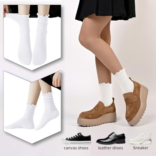 • Comfort and Trendy Design: These silky, breathable white ruffle socks with loose ruffled cuffs not only enhance leg circulation but also provide a snug fit perfect for all seasons.Their light fit ensures a snug feel against the skin, while the blend of cuteness and elegance elevates your style, providing a supremely comfortable wearing experience