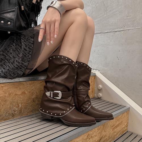 JANSEVEN Women Western Boots Mid Culf Cowgirl Boot Fold Over Casual Boots with Chunky Heel Fashion Slouchy Boot Pull On 6