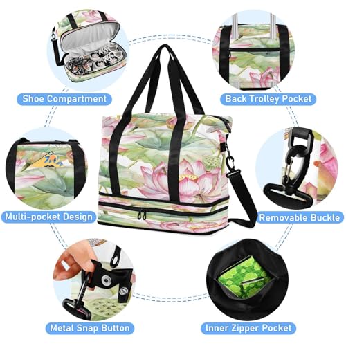 Lotus and Dragonflies Gym Bag - Weekender Overnight Bags for Women Men, Sport Travel Duffel Bag with Wet Pocket & Shoe Compartment 7