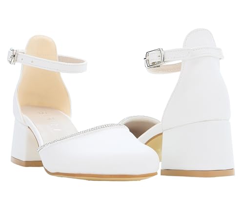 SIRRI Girls’ Block Heel Mary Janes, Ankle Strap Closed Round Toe Rhinestone Trim Communion Shoes