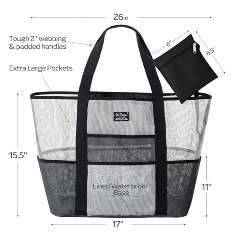 popular ! SoHo, Mesh Beach Bag - Toy Tote Bag - Large Lightweight Market, Grocery & Picnic Tote with Oversized Pockets (Black/White)