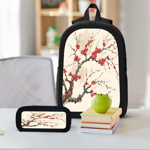 3PCS Backpack for Women Men With Lunch Box Pencil Bag 17 Inch Lightweight Adjustable Strap Back Pack 3 In 1 Set Plant Red Flower Casual Daypack Unisex Fit Travel Work Camping