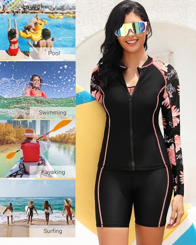 • 3 piece rash guard swimsuit:3 piece swimsuits for women includes athletic sport bra, Boyleg swim biker shorts with side pockets and long sleeve full zip swim shirt jacket. It has versatility of being able to wear it with or without the jacket.