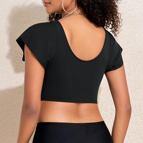 Fabric type: 80% Polyamide, 20% SpandexCare instructions: Hand Wash OnlyOrigin: ImportedClosure type: Pull OnPush Up bikini top features an underwire design that provides bust support. Swim top comes with removable padding, allowing you to customize your fit for comfort and confidenceSupportive bikini tops designed with non-adjustable shoulder straps and charming short sleeves adorned with ruffle details, swimsuit top exudes elegance and playfulnessV neck swimsuit tops with a front twist ruched design provides excellent lift and shaping, underwire bikini tops enhances your natural curves for a stunning beach-ready lookLongline bikini top provides moderate coverage, making it easy to pair with tankini or bikini bottoms, skirts, or shorts. Mix and match to create your ideal summer outfit.Front twist bathing suit tops made from tender, breathable material that is durable and wrinkle-resistant, short sleeves bikini top is perfect for summer wear Perfect for everyday use. superior materials and excellent craftsmanship ensure long-lasting durability.