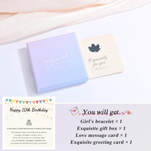 Material: StoneMetal type: BrassChain type: Cable ChainGem type: No gemstone10th Birthday Gifts: 10 stone beads for 10 fabulous years. Celebrate your girl's 10 year old birthday with this meaningful gift, inspire her and give her love and strength to face challenges.10 Year Old Girl Gift Ideas: This birthday bracelet includes a meaningful meassage card and a blank card to add your personal note. It is the superb 10 year old birthday gift for your niece, daughter, granddaughter, sister, best friend.Beaded Bracelet: Made of 4mm different colored stones and gold plated brass chain. It is superior and hypoallergenic. Please notice that the beads are tiny and the colors are randomly selected.Adjustable Size: This beaded bracelet length is 6.7 inches + 2 inches extension chain. It is suitable for most girls, teens, and women.JEIKTO After-Sales Service: Your satisfaction matters! If our Happy 10th Birthday Bracelet doesnβt meet your expectations, reach out to our friendly team for support. Weβre here to ensure your gift melts hearts. Perfect for everyday use. High quality materials and excellent craftsmanship ensure long-lasting durability.