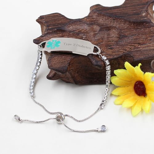 • ♥ Style: sleek AAA+ Cubic Zirconia Tennis Chain Medical Alert Bracelet for Women. Personalized medical identity bracelet. Medical awareness bracelet.