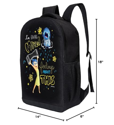 • OFFICIALLY LICENSED DISNEY INSIDE OUT BACKPACK: Step into the animated world of Disney's Inside Out with our officially licensed 18 Inch Backpack. Featuring the endearing characters Joy and Sadness alongside the witty quote "I'm Having Mixed Feelings About This," this knapsack is a playful homage to the delightful movie.