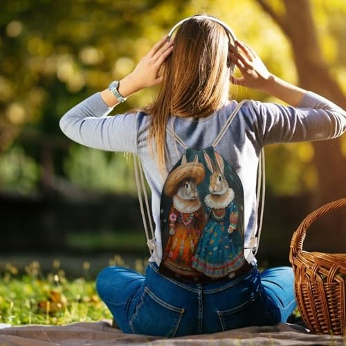 Vintage Two Rabbits Drawstring Backpack Canvas String Bag Lightweight Sports Gym Bag for Men Women 2