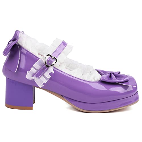 LUXMAX Women Bow Mary Janes Patent Leather Platform Sweet Lace Pumps Chunky Mid Heel Cute Shoes 7