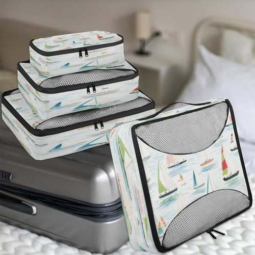 4 Set Packing Cubes for Travel, Nautical Sailboat Packing Cubes for Women, Travel Luggage Packing Organizers, Packing Cube Set, Cartoon Sailboat 6