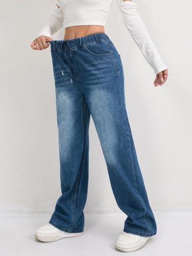 • STYLE & FIT: High-waisted wide-leg jeans featuring a relaxed flared silhouette and elastic drawstring waistband for maximum comfort