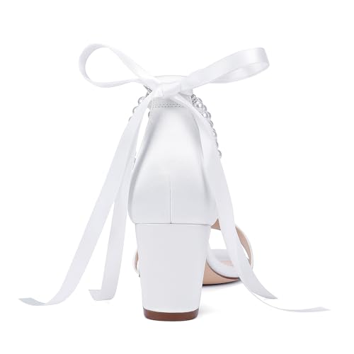 Isobud Women's Open Toe Pearl Wedding Shoes for Bride White Heels with Bow Bridal Shoes Chunky Block Satin Heels Sandals 5