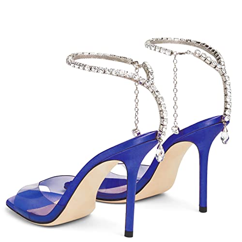 Women's Heeled Sandals Crystal Chain Ankle Strap Rhinestone Buckle Square Open Toe Stiletto High Heels Wedding Party Satin Dress Shoes 5