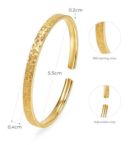 Material: Sterling SilverMetal type: SilverClasp type: Open CuffChain type: Solid BandGem type: No gemstone【Bangle Bracelets for Women】This dainty bracelet for women features a special cracked-ice surface design, meticulously crafted to refract light like delicate frost patterns. While being visually appealing without compromising durability.【Sterling Silver Bracelets】Crafted from S999 sterling silver plated with 24K gold, this gold bracelet delivers luxe brilliance while maintaining enduring quality. The nickel-free, hypoallergenic material makes it ideal for sensitive skin, combining elegance with everyday comfort.【Adjustable Open Cuff】This minimalist bangle bracelets features a flexible, open design that allows for easy one-handed wear, making it ideal for daily use. The adjustable opening ensures a perfect fit for most wrist sizes, eliminating the need to worry about sizing.【Perfect Gift for Her】This gold bangles for women is the perfect gift for mothers, couples, wives, or as a treat for yourself. It is suitable for birthdays, Valentine's Day, Christmas, Mother's Day, anniversaries, and other occasions.【D-POW After-Sales Service】Your satisfaction is our top priority. If you have any questions about our women's jewelry, please contact us—we have a customer service team that responds promptly 24 hours a day. In addition, D-POW offers a 90-day money-back guarantee and a lifetime warranty, ensuring you a worry-free shopping experience.【Care & Maintenance】To preserve beauty of women's jewelry: 1. Storage: When not worn, store individually in a soft cloth or jewelry box to prevent scratches. 2. Cleaning: Gently polish with a dry, soft cloth. Avoid water, chemicals, or abrasive materials. 3. Wear with Care: Remove before bathing, swimming, or applying lotions/perfumes to minimize chemical exposure. 4. Prevent Tarnishing: Keep dry and clean to maintain its luster and reduce oxidation. Perfect for everyday use. top-grade materials and excellent craftsmanship ensure long-lasting durability.