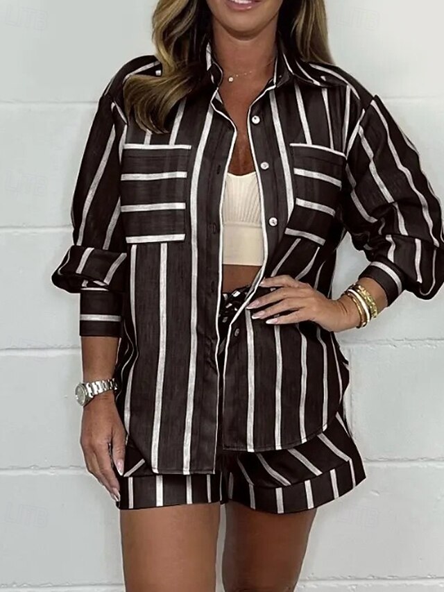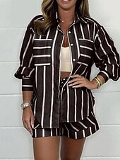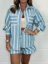 More information about Women's Active Fashion Shirt Blouse Shorts Sets Long Sleeve Shirt Collar Striped Daily Wear Going out Weekend Black White Light Green Fall Regular Fit