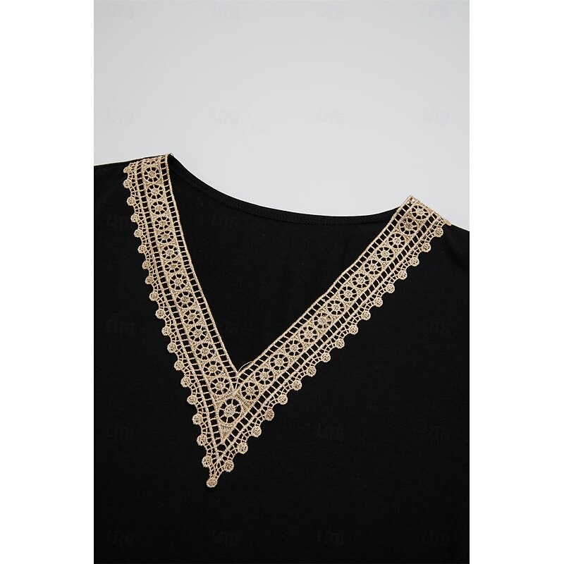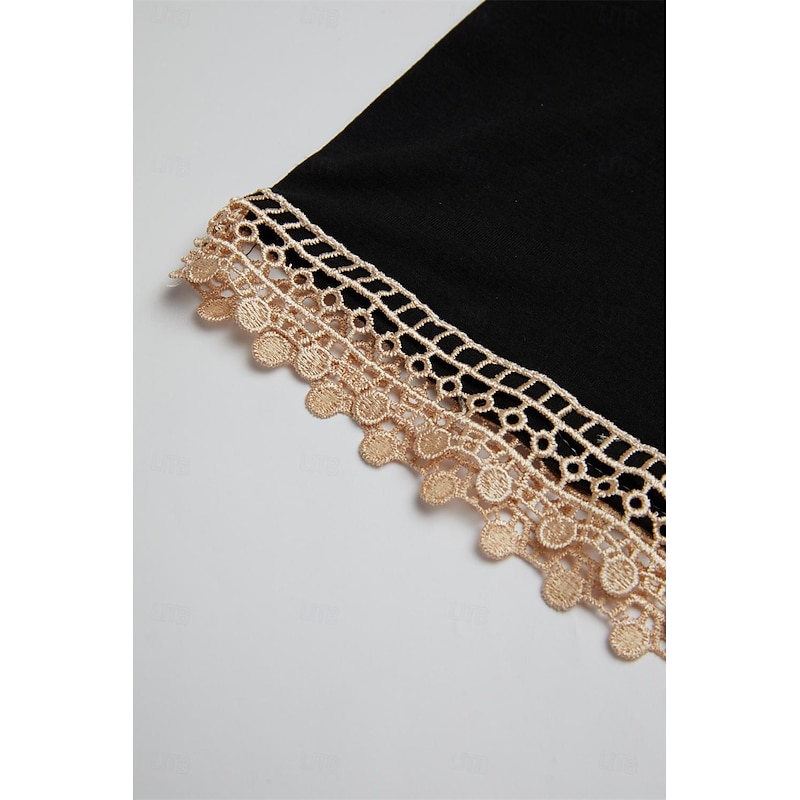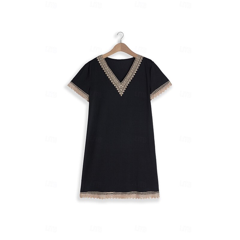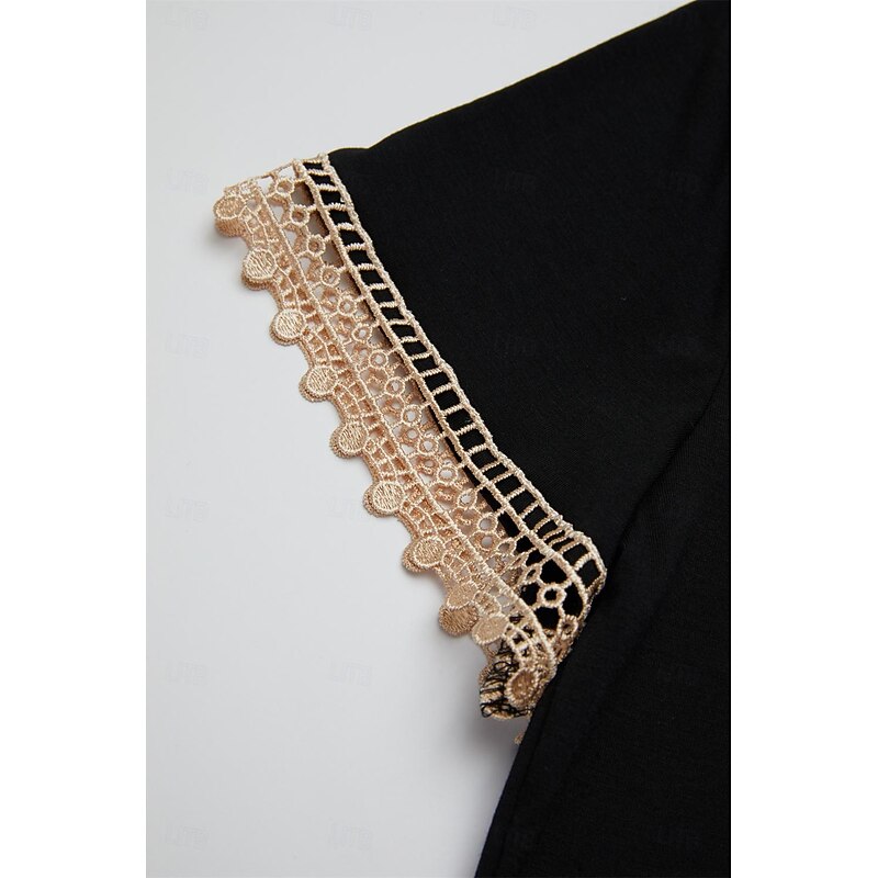 Women's Casual Dress V-neck Short Sleeve Crochet Lace Trim Solid Black Knee-length Versatile Summer Fashion cozy Fit Various Sizes