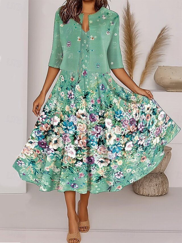 popular ! Women's Two Piece Dress Sets Midi Dress with Jacket Elegant A Line Dress Half Sleeve Casual Semi Formal Ombre Floral Print V Neck Date Red Sky Blue Green Regular Fit