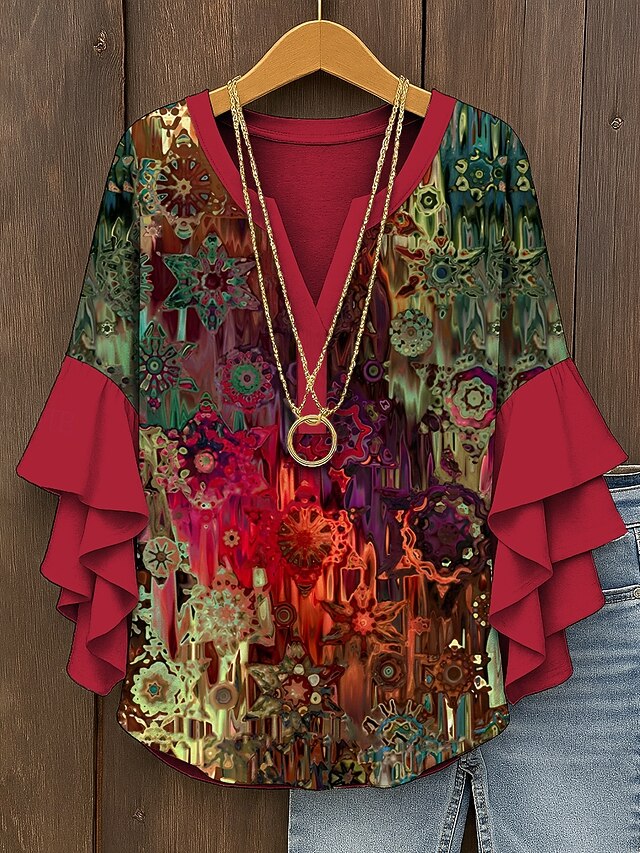 popular ! Women's Retro Blouse Layered Ruffle Sleeve Tops Vintage Graphic Abstract Bohemia Vintage Daily 3/4 Length Sleeve Regular Tops Daily Holiday Vacation Wear Print Red Blue Purple Green Summer