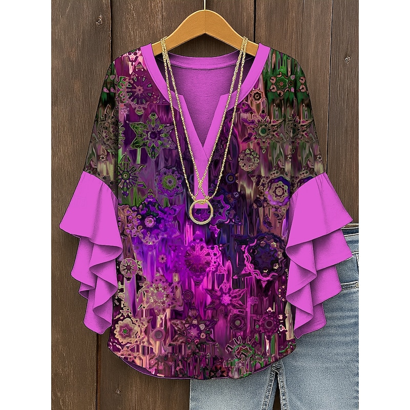 More information about Women's Retro Blouse Layered Ruffle Sleeve Tops Vintage Graphic Abstract Bohemia Vintage Daily 3/4 Length Sleeve Regular Tops Daily Holiday Vacation Wear Print Red Blue Purple Green Summer