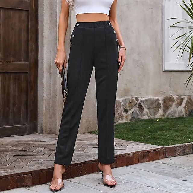 Highlights [Fabric]: Crafted from high-quality polyester, these women's dress pants offer a breathable and micro-elastic fit, providing comfort throughout spring and summer days. The plain black fabric is versatile and can easily be matched with a variety of tops to create numerous chic outfits. [Fit]: Designed with a regular fit and high waist, these pants accentuate the figure while offering a sleek and modern look. The straight leg cut allows for a classic silhouette that is both flattering and adaptable to different styles, perfect for casual and formal settings alike. [Design Highlights]: These pants feature elegant button details on the sides, adding a sophisticated touch to the overall design. The elastic waistband ensures a secure and comfortable fit, while maintaining style and functionality. [Occasions]: Ideal for daily wear and work, these pants are versatile enough for any setting, from professional workplaces to casual outings. Their classic design and comfortable fit make them a great addition to any wardrobe, suitable for a variety of occasions. [Size Availability]: Available in a range of sizes from S to 2XL, these pants are designed to suit a wide range of body types, ensuring numerous style options and a comfortable fit for all. Perfect for everyday use. top-grade materials and excellent craftsmanship ensure long-lasting durability.