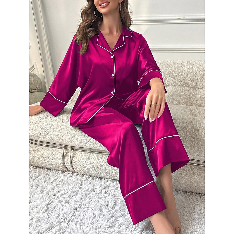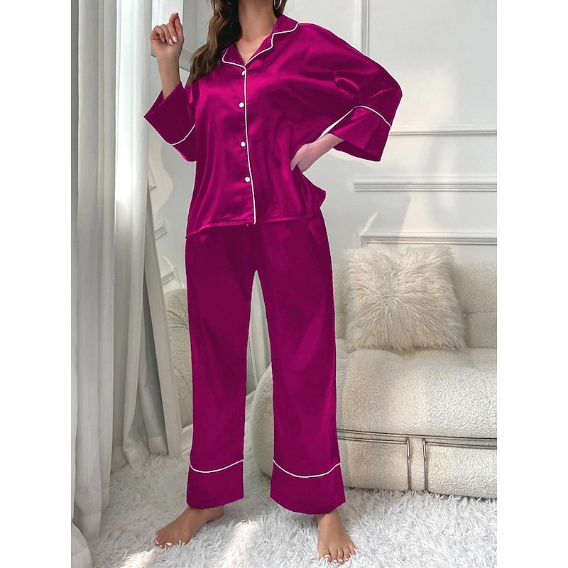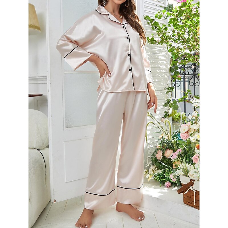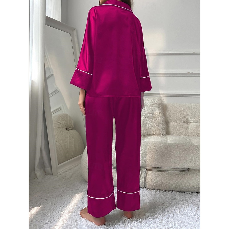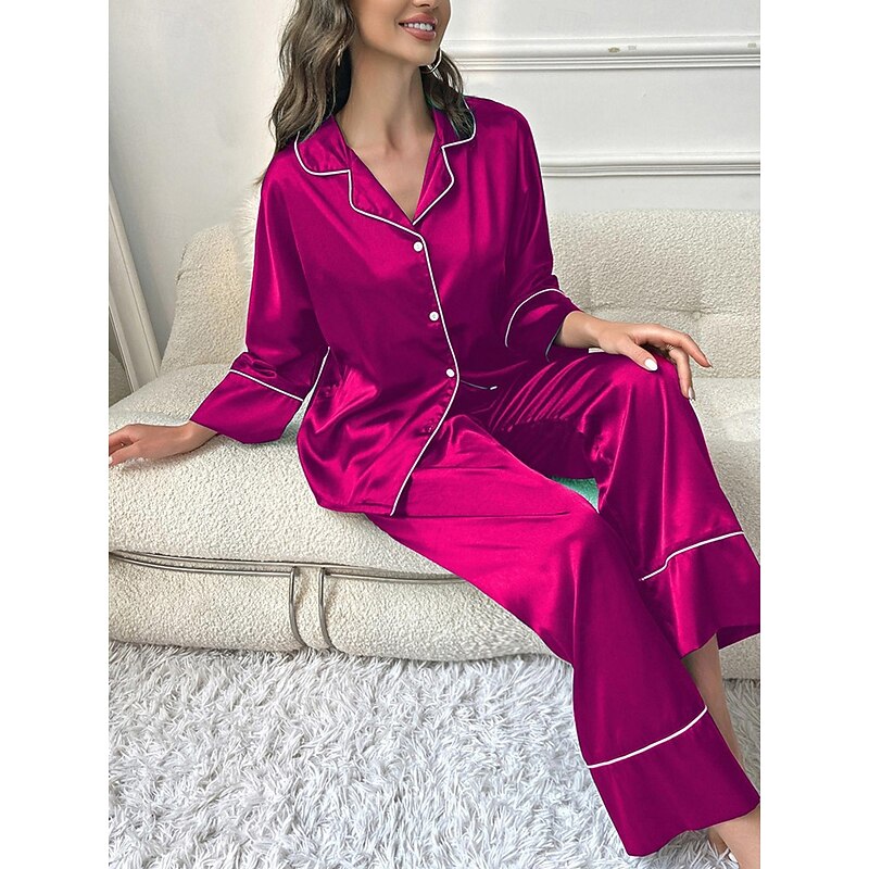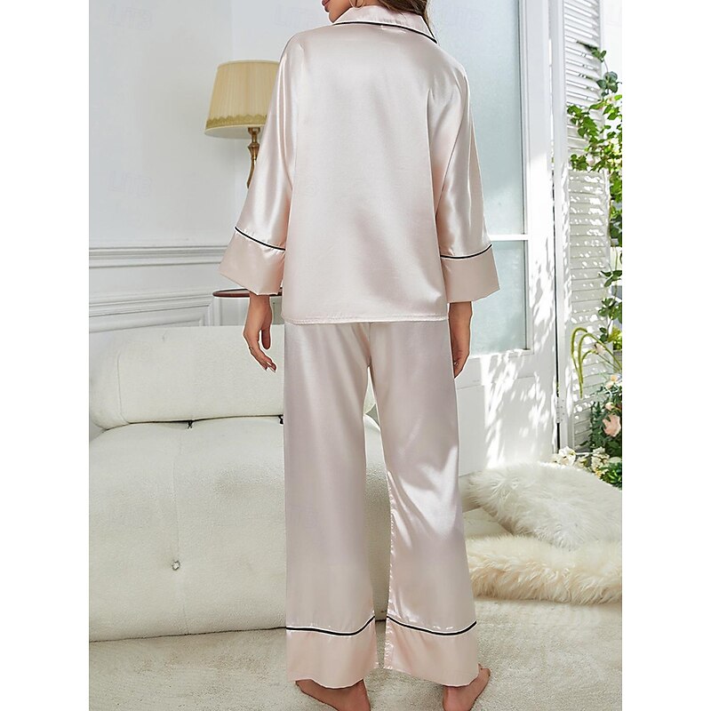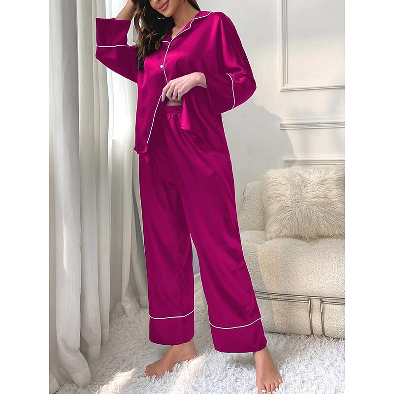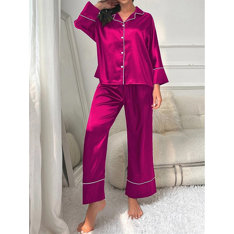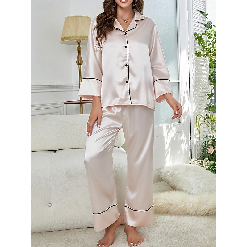 More information about Women's Pajamas Sets Pure Color Fashion Comfort Home Daily Bed Faux Silk Silk Breathable Lapel Long Sleeve Shirt Pant Button Pocket Fall Home Outfits