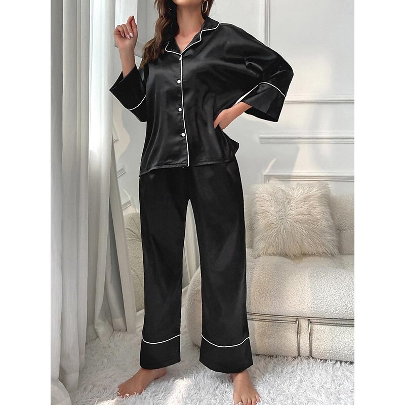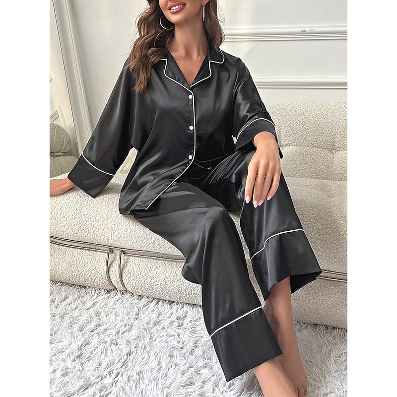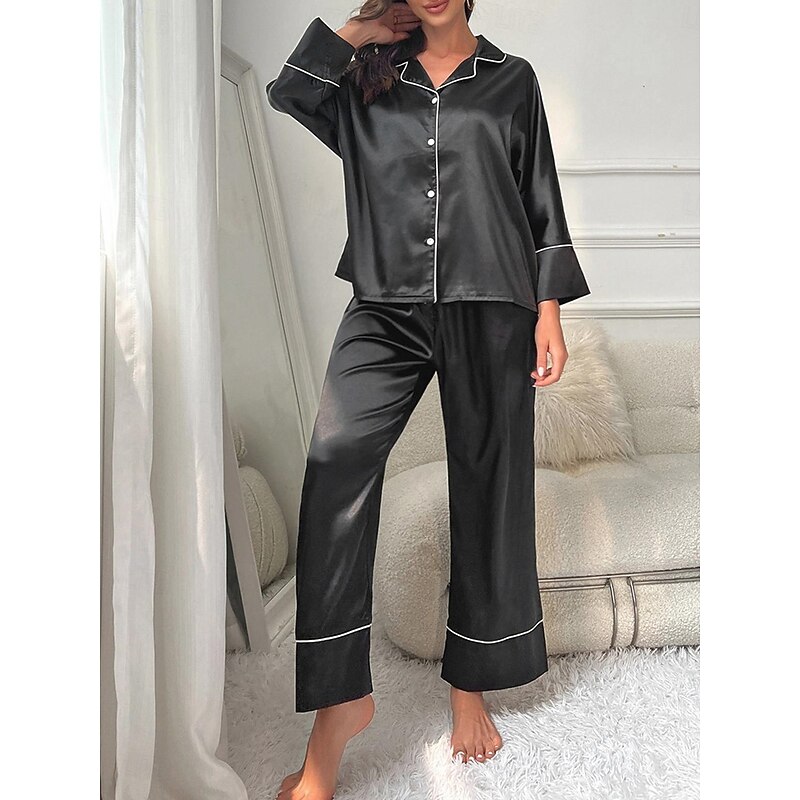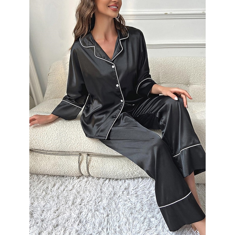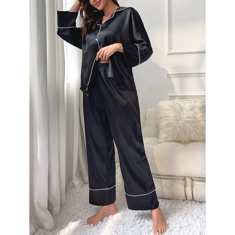 Highlights [Fabric] Crafted from a blend of silk and faux silk, the fabric of this pajama set offers a breathable, lightweight, and smooth texture, ensuring a relaxing and soft experience against the skin. The material's silky finish adds a touch of luxury to your nightwear collection. [Fit] The pajama set is designed with a long-sleeve button-up top and relaxed fit pants. The tailored cut of the pants allows for ease of movement, making these pajamas perfect for lounging. [Design Highlights] Featuring a enduring lapel neckline and adorned with elegant white piping along the edges, this set exudes timeless elegance. The long-sleeve shirt includes a button-up front and a convenient pocket, while the pants have an elastic waist with coordinating white piping detail at the cuffs. [Occasions] Ideal for daily wear, bed, and home, this pajama set is perfect for a cozy night in or a relaxing day at home. Its sophisticated yet simple design makes it suitable for both lounging and sleeping. [Size Range] Available in sizes S, M, L, and XL, ensuring a comfortable fit for a variety of body types.