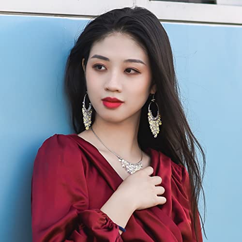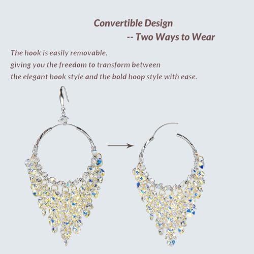 Material: CrystalMetal type: Sterling SilverBack Finding: French WireEarring design: DangleMake it Mesmerizing: The long, dangling fringes, crafted with sparkling Austrian Crystals, elevate your outfit with a kaleidoscope of color. Pair them with the matching necklace for a bold statement or wear them alone to add a dazzling touch to your everyday or evening attire.Material: Made from high-quality 925 Sterling Silver and Iridescent Aurora Borealis Austrian Crystals, these earrings are lead-free, nickel-free, and hypoallergenic. The AB coating on the crystals creates stunning color variations in different lighting.Product Specifications:Length: 4.09 inches,Fringe Dangle Size: 1.96 x 1.58 inches,Hoop Diameter: 1.56 inches,Hoop Thickness: 0.56 inches,Weight: 15g per earring (Please note that slight variations may occur due to manual measurement. The actual dimensions are subject to the final product.)Handcrafted Design: These hoop earrings combine cascading fringe tassels with twinkling Austrian Crystals, creating a one-of-a-kind and stunning boho-inspired aesthetic. A true statement piece that’s sure to turn heads.Versatile and Eye-Catching: Whether as a bold accessory with a cocktail dress or a casual chic touch for everyday wear, these earrings add a pop of color and glamour to any outfit. Perfect for everyday use. superior materials and excellent craftsmanship ensure long-lasting durability.