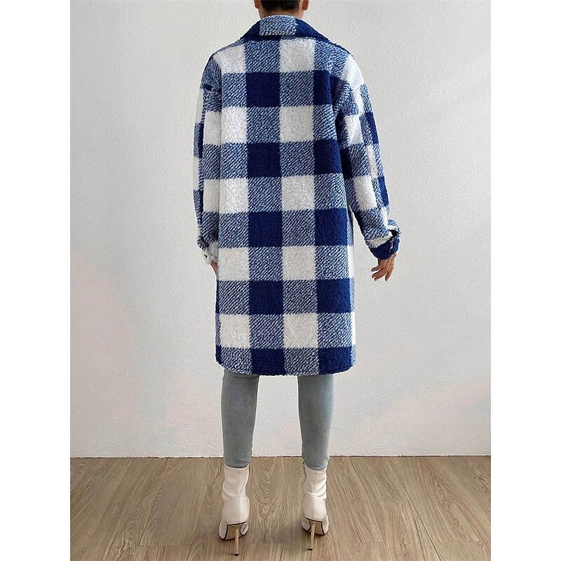 Women's Fleece Jacket Teddy Coat Warm Breathable Pocket Fleece Lined Casual Plaid Vacation Street Daily Wear Going out Single Breasted Long Turndown Regular Fit Long Sleeve Outerwear Black Blue 7