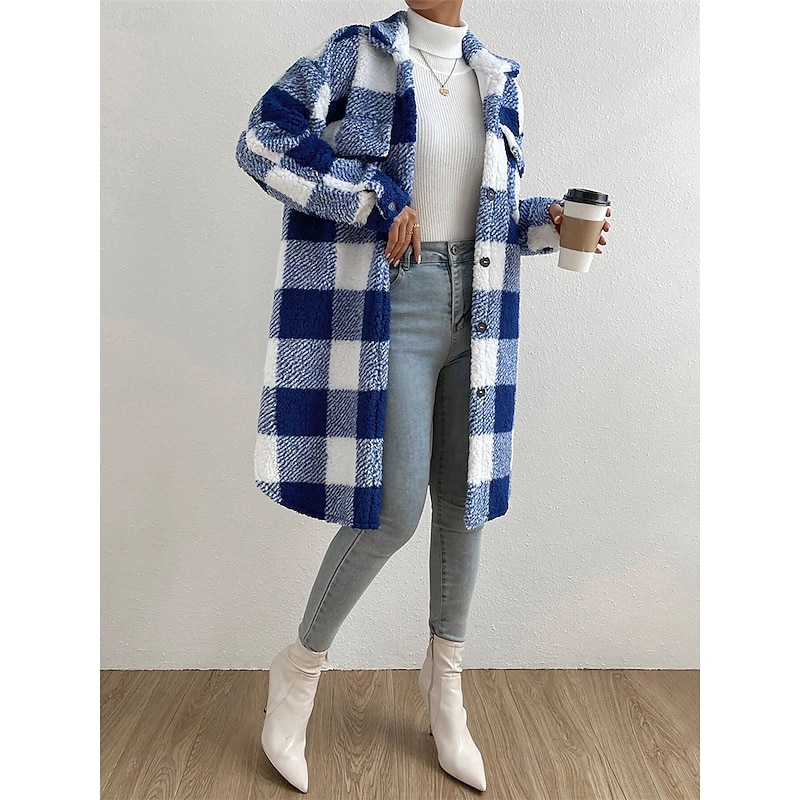 Women's Fleece Jacket Teddy Coat Warm Breathable Pocket Fleece Lined Casual Plaid Vacation Street Daily Wear Going out Single Breasted Long Turndown Regular Fit Long Sleeve Outerwear Black Blue 11