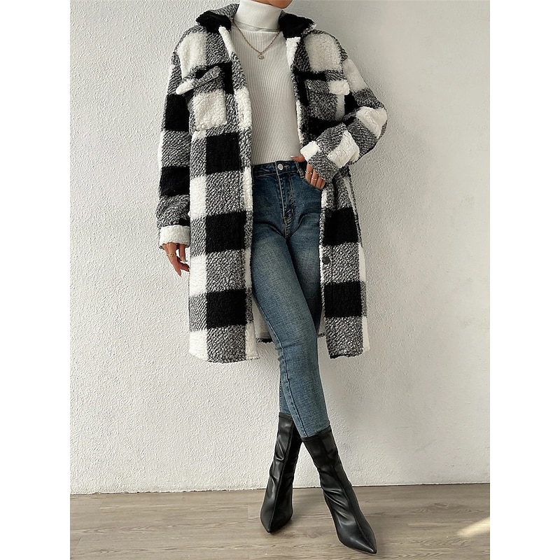 Women's Fleece Jacket Teddy Coat Warm Breathable Pocket Fleece Lined Casual Plaid Vacation Street Daily Wear Going out Single Breasted Long Turndown Regular Fit Long Sleeve Outerwear Black Blue 10