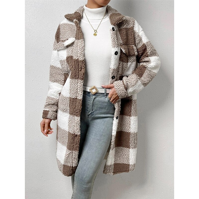 popular ! Women's Fleece Jacket Teddy Coat snug Breathable Pocket Fleece Lined Casual Plaid Vacation Street Daily Wear Going out Single Breasted Long Turndown Regular Fit Long Sleeve Outerwear Black Blue