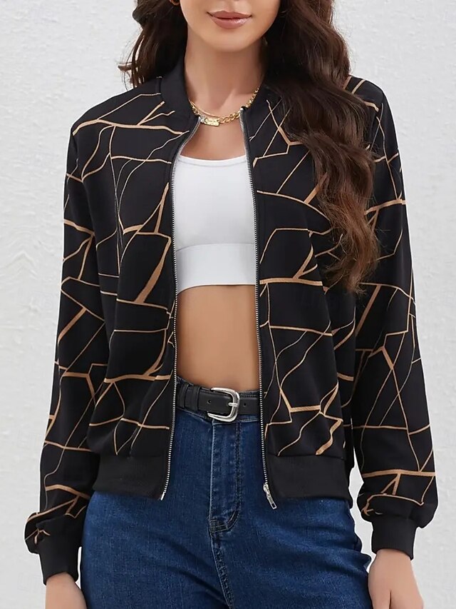This Women's Bomber Jacket relaxing Breathable Zipper Print Casual Geometric Vacation Street Casual Daily Wear Zipper Regular Stand Collar Regular Fit Long Sleeve Outerwear Black Wine Navy Blue Spring combines elegant design with practical functionality. Every detail has been carefully considered to ensure you get the best possible experience. The first-class construction means this product will serve you well for years to come.