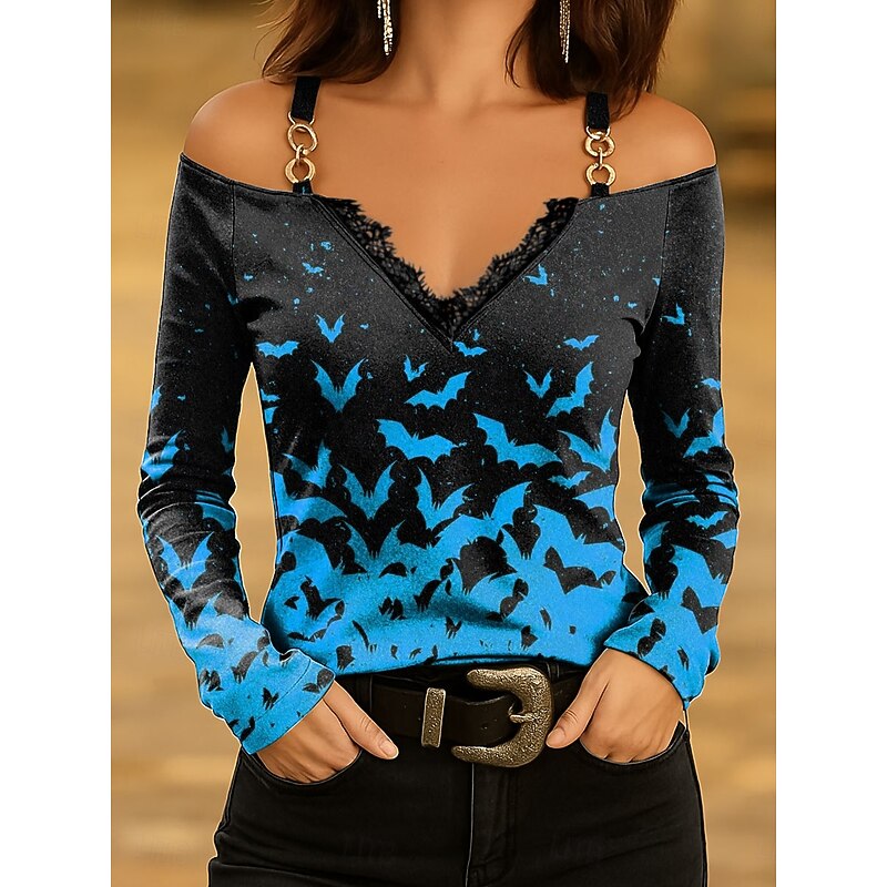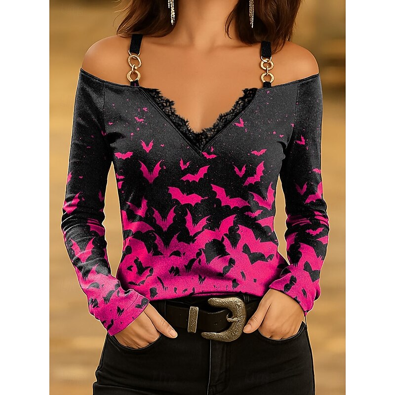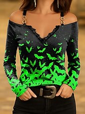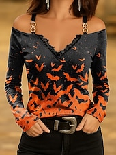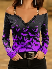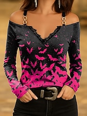 This Halloween Women's T shirt Bat Long Sleeve Ombre Graphic Vintage trendy Classic Long Sleeve V Neck Regular Tops Daily Lace Print Pink Blue Purple Orange Green Spring Fall Prefall combines elegant design with practical functionality. Every detail has been carefully considered to ensure you get the best possible experience. The first-class construction means this product will serve you well for years to come.