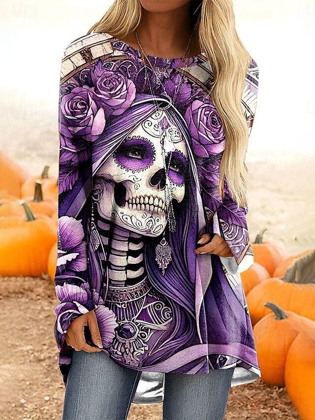 Why Choose Halloween Women's T Shirt Skulls Graphic Vintage sleek Casual Long Sleeve Crew Neck Long Tops Daily Print Red Purple Orange Khaki Spring Fall?