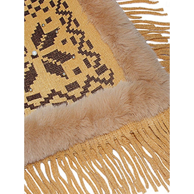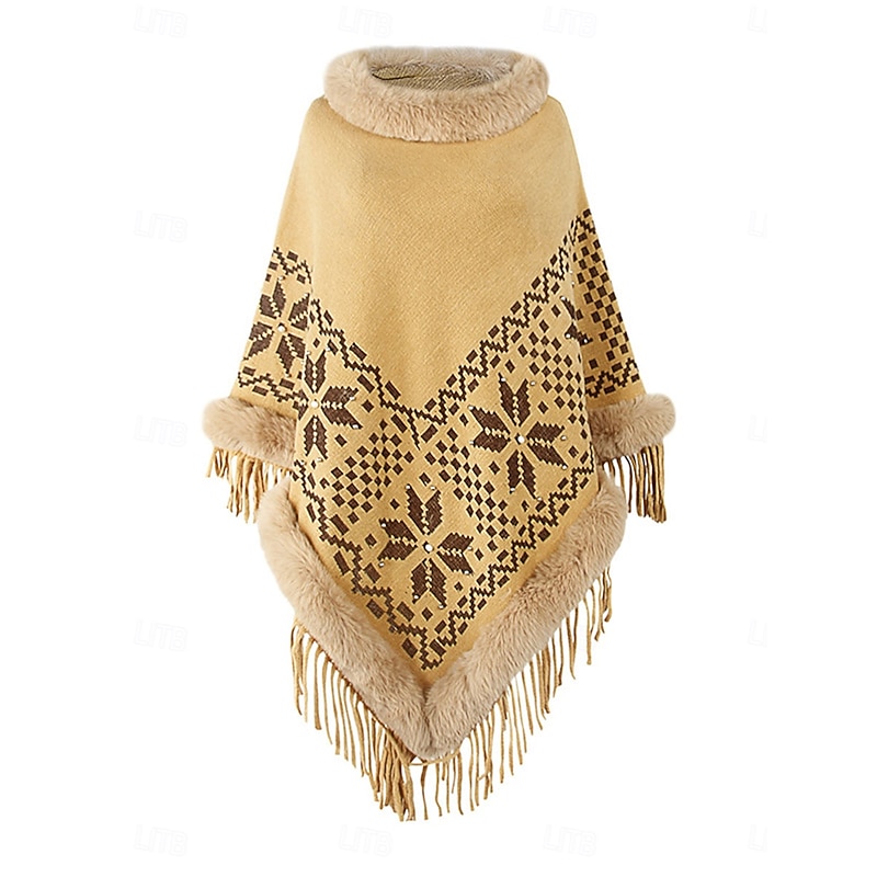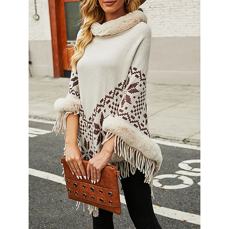 : The poncho boasts a chic turtleneck and a luxurious faux fur trim along the neckline and edges, enhancing its sophisticated appeal. The intricate ribbed knit pattern, complemented by a striking argyle design, is set off by a playful tassel fringe, giving it a bohemian-chic look.