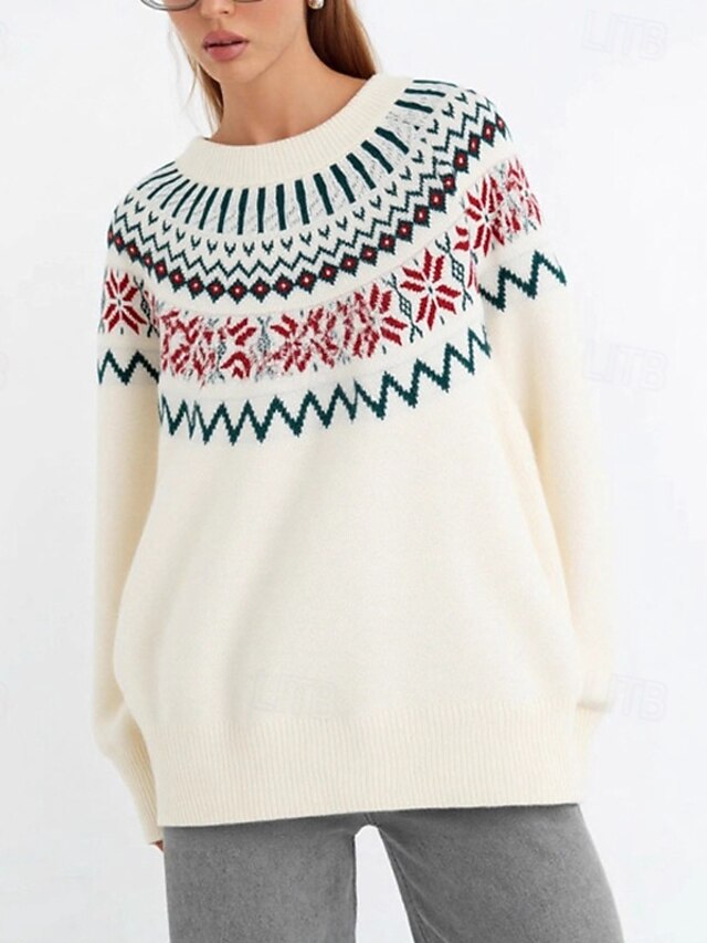 popular ! Women's Sweater Fair Isle Sweater Fashion Streetwear Casual Snowflakes Ribbed Crew Neck Knitted Long Sleeve Regular Tops Knit Outdoor Daily Weekend White Fall Winter