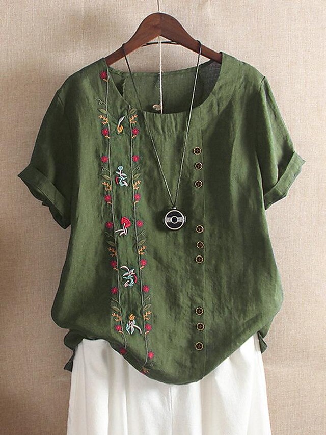 Why Choose Women's Shirt Linen-Inspired Shirts Blouse Floral Casual Short Sleeve Crew Neck Regular Tops Vacation Daily Embroidered Green Summer?