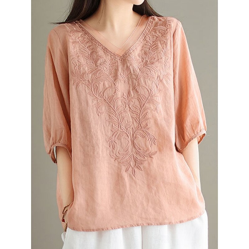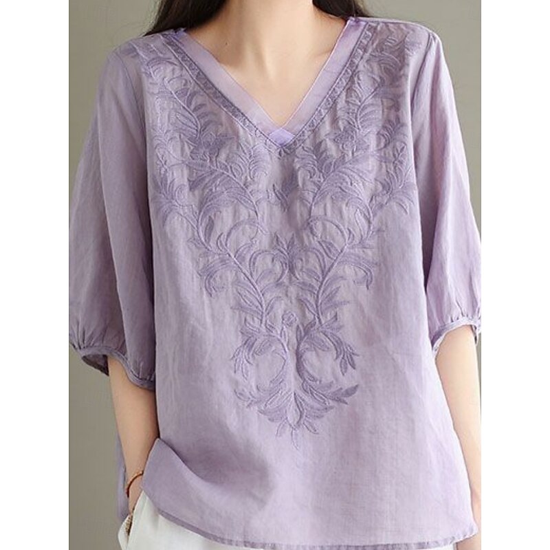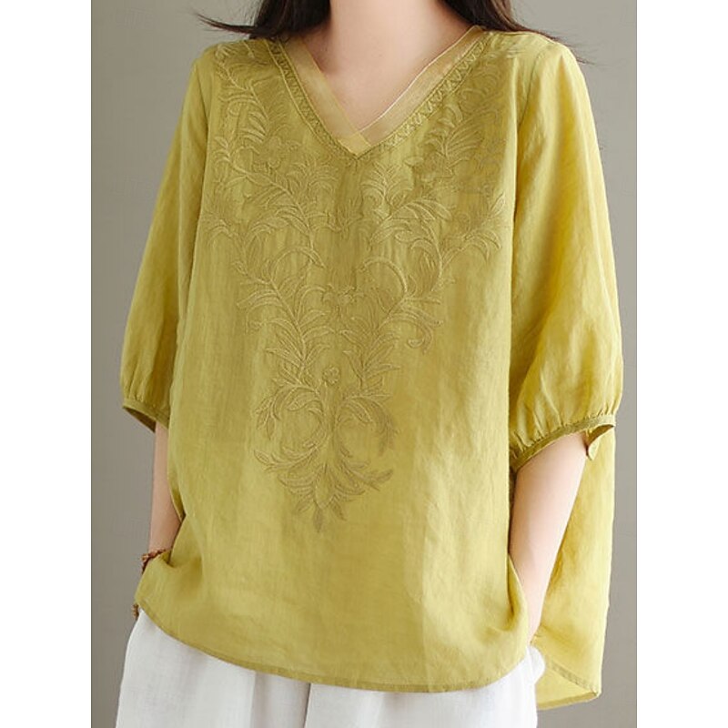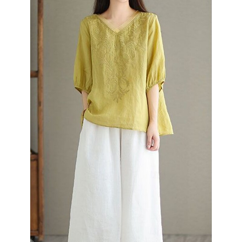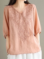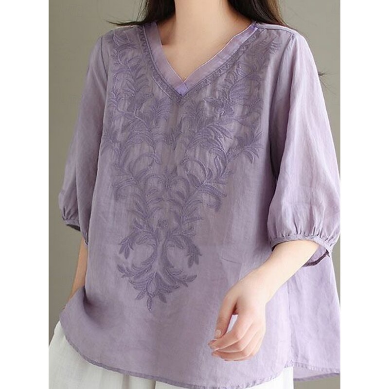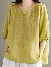 More information about Women's Shirt Blouse Cotton Linen Shirts Solid Color Basic Casual 3/4 Length Sleeve V Neck Regular Tops Daily Embroidered White Yellow Pink Purple Summer Spring
