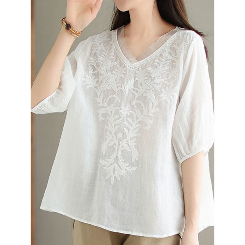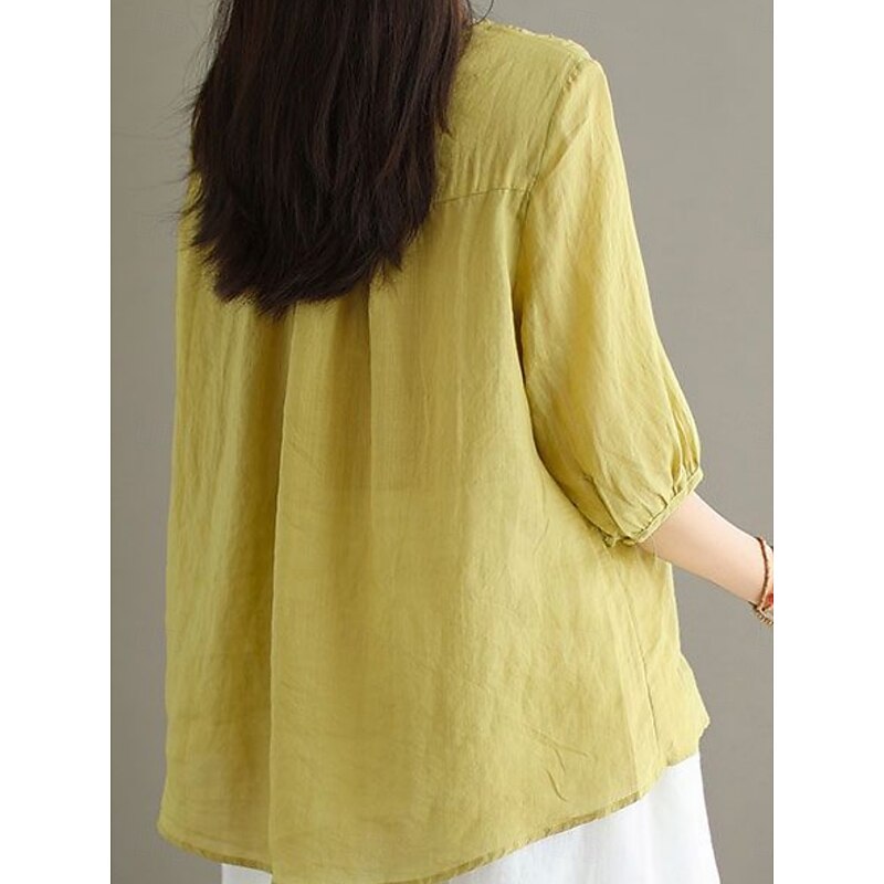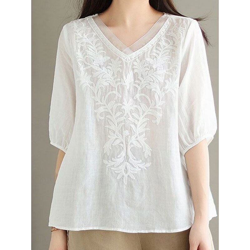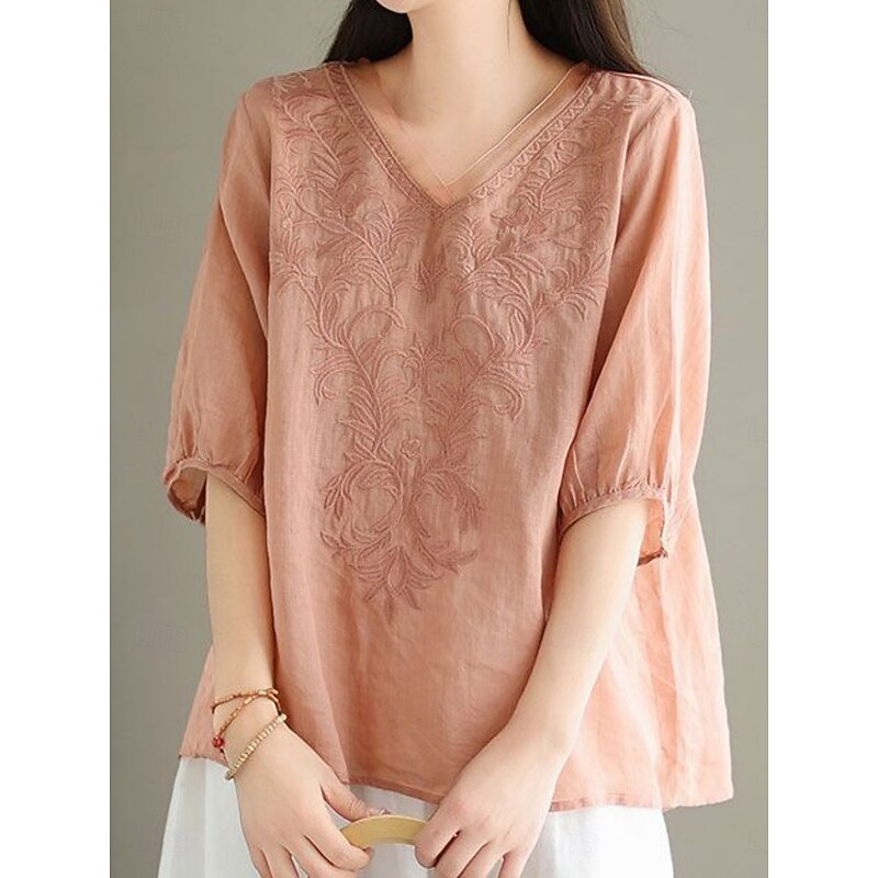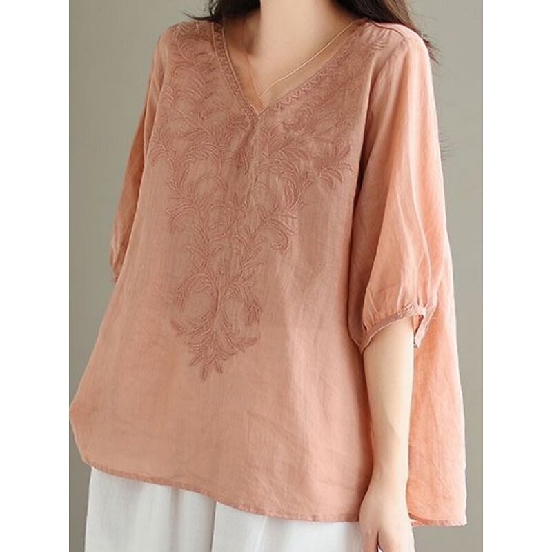 More information about Women's Shirt Blouse Cotton Linen Shirts Solid Color Basic Casual 3/4 Length Sleeve V Neck Regular Tops Daily Embroidered White Yellow Pink Purple Summer Spring