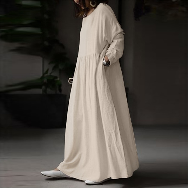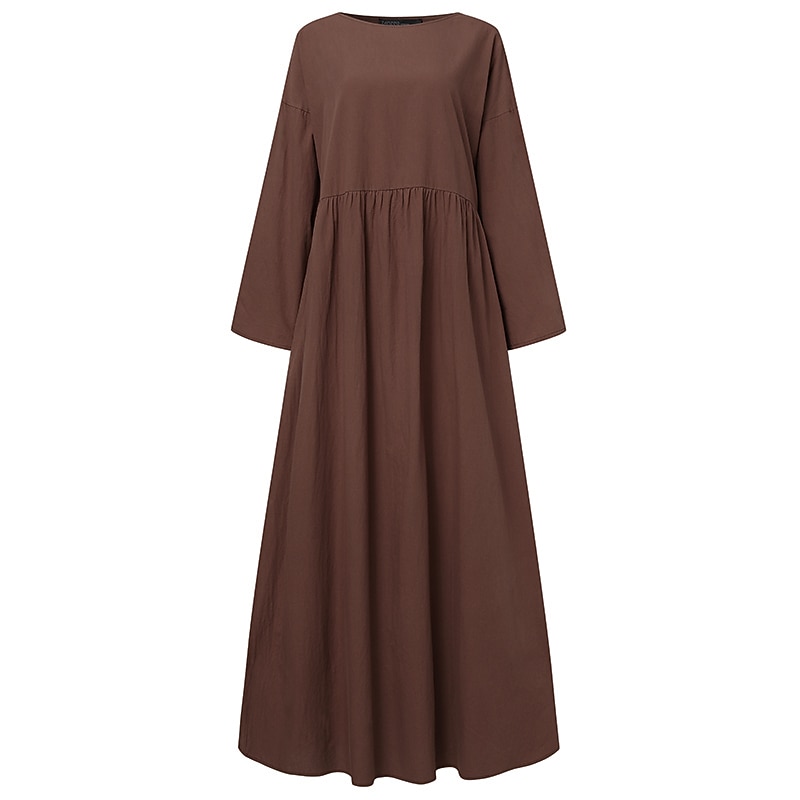 Highlights [Fabric] : This women's maxi dress is made from a luxurious blend of cotton and linen, offering a soft, breathable, and micro-elastic fabric ideal for all-year wear. The high-quality materials ensure comfort and durability, suitable for any occasion. [Fit] : The dress features a loose fit with a relaxed silhouette, making it perfect for those who prefer comfort and ease of movement. Its maxi length provides full coverage, while the slightly flared hem delivers a graceful and flowing look. [Design Highlights] : The dress presents a chic crew neck and long sleeves, along with a sleek patchwork design that adds a unique touch. The gathered waistline subtly enhances the fit, adding a flattering dimension to the overall shape. [Occasions] : Ideal for a variety of settings, including dates, vacations, holidays, daily outings, and weekend gatherings. This versatile piece can easily transition from casual daywear to a more polished look with the right accessories. [Size Range] : Available in a wide range of sizes, including S, M, L, XL, 3XL, 4XL, and XXL, ensuring a comfortable fit for many body types. The thoughtful sizing options are designed to accommodate different preferences and styles. Perfect for everyday use. superior materials and excellent craftsmanship ensure long-lasting durability.