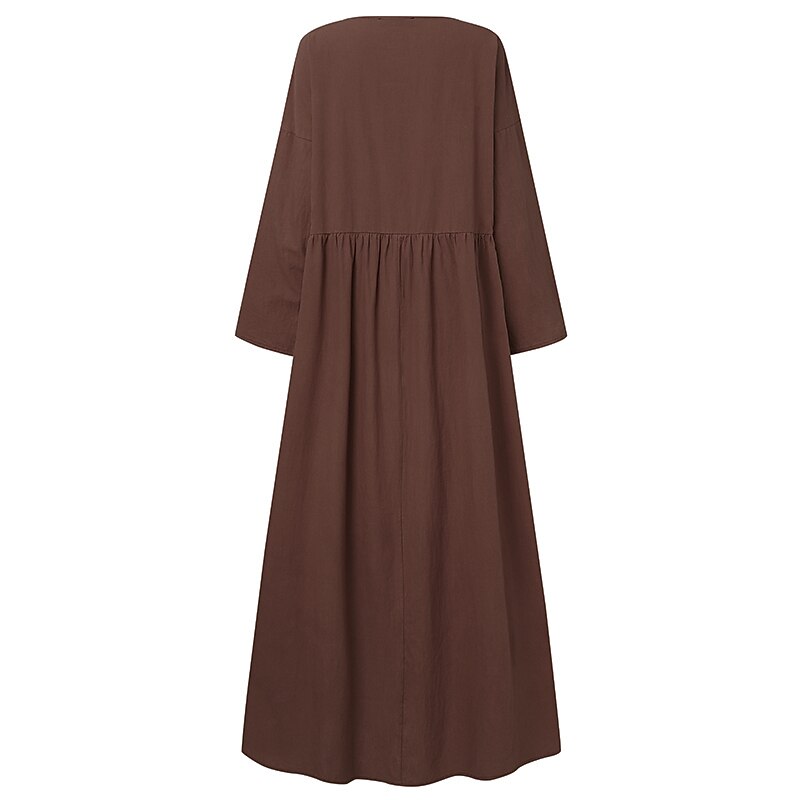 Women's Linen-Cotton Blend Maxi Dress Long Sleeve Loose Fit Patchwork Crew Neck Casual