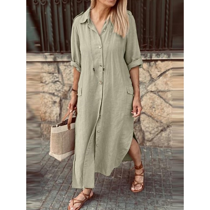 Highlights [Fabric] Crafted from high-quality cotton and linen, this maxi dress offers a comfortable and breathable experience, perfect for transitioning between spring and fall. The micro-elastic properties of the fabric ensure a relaxed fit that's both practical and sleek, ideal for all-day wear. [Fit] Designed in a loose fit style, the maxi dress boasts a flowy silhouette that allows for ease of movement and an effortlessly chic appearance. The longline cut enhances its elegance, while the shirt collar adds a touch of sophistication to the overall design. [Design Highlights] This dress features a iconic shirt collar and a button-front design that enhances its stylish appeal. The long sleeves can be casually rolled up, providing versatility in styling. Practical side pockets are integrated into the design, offering convenience for carrying small essentials. [Occasions] Versatile and chic, this dress is suitable for a variety of occasions, such as outdoor parties, casual outings, and relaxed gatherings. Its earthy tones make it an easy choice for pairing with your favorite sandals and a tote bag, perfect for a day of shopping or a laid-back dinner. [Size Range] Available in sizes S, M, L, XL, and 2XL, this dress provides a broad size range to accommodate different body types, ensuring a flattering fit for many.