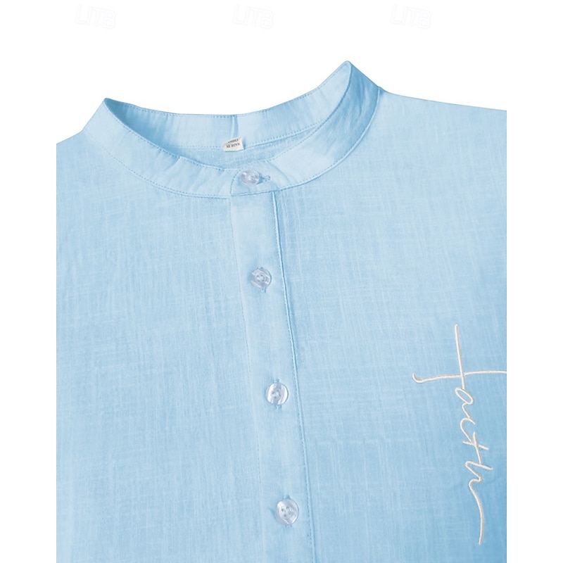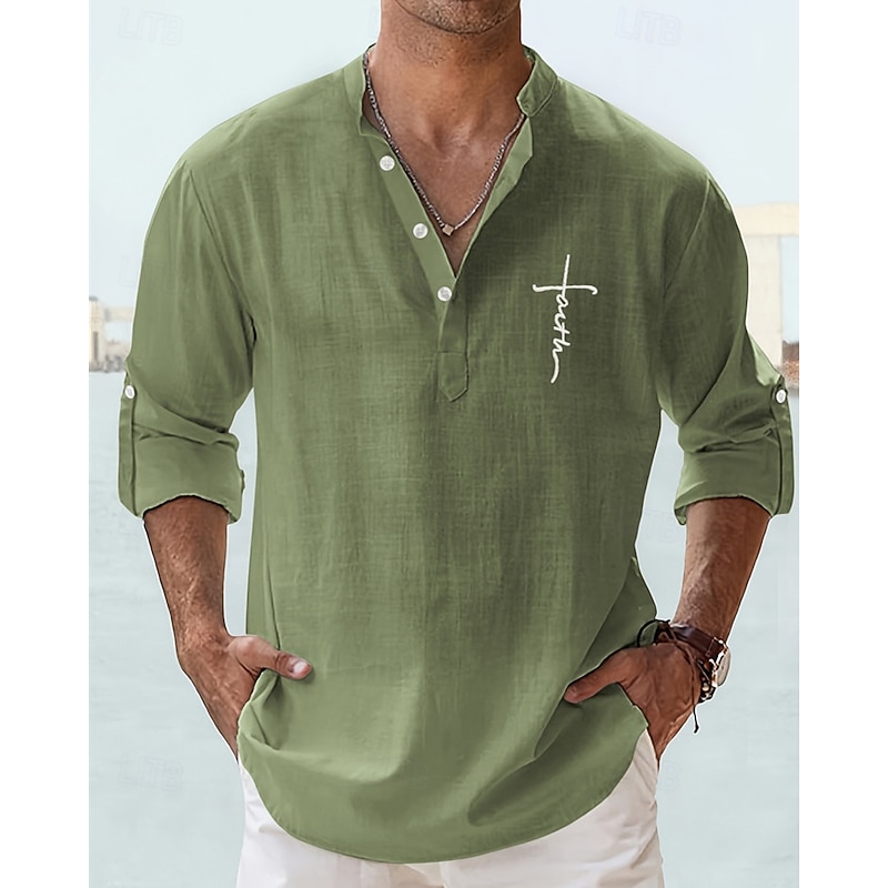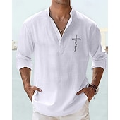 Men's Shirt Linen Shirt Popover Shirt Casual Shirt Cotton Shirt Cross Vacation Hawaiian Black White Yellow Pink Long Sleeve Band Collar Spring Fall Clothing Apparel Print 19