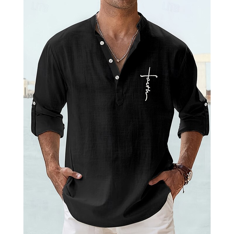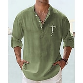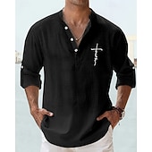 Men's Shirt Linen Shirt Popover Shirt Casual Shirt Cotton Shirt Cross Vacation Hawaiian Black White Yellow Pink Long Sleeve Band Collar Spring Fall Clothing Apparel Print 14